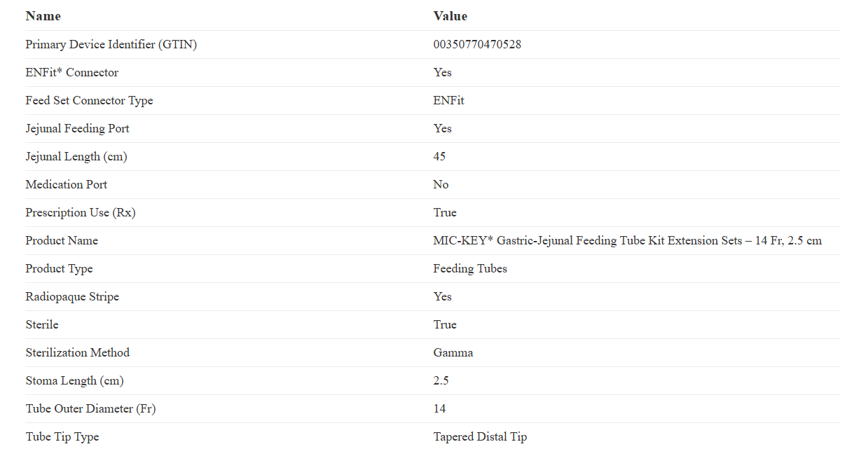 The MIC-KEY Low-Profile Gastric-Jejunal Feeding Tube is a single unit feeding/ drainage device. It enters the stomach through a gastric stoma. The tube is held in place (within the stoma tract) by means of an inflatable balloon and a low-profile external bolster. The external bolster contains two ports; one labeled “JEJUNAL” and one labeled “GASTRIC”. Incorporated within each port is a one-way valve which is opened by attaching the appropriate MIC-KEY Extension Set. MIC-KEY Extension Sets connect to the feeding and drainage ports. The JEJUNAL port is used for feeding into the small intestine. The GASTRIC port is used to drain the stomach with the use of low intermittent suction or gravity drainage. A third port labeled “BAL” is used to inflate and deflate the balloon.